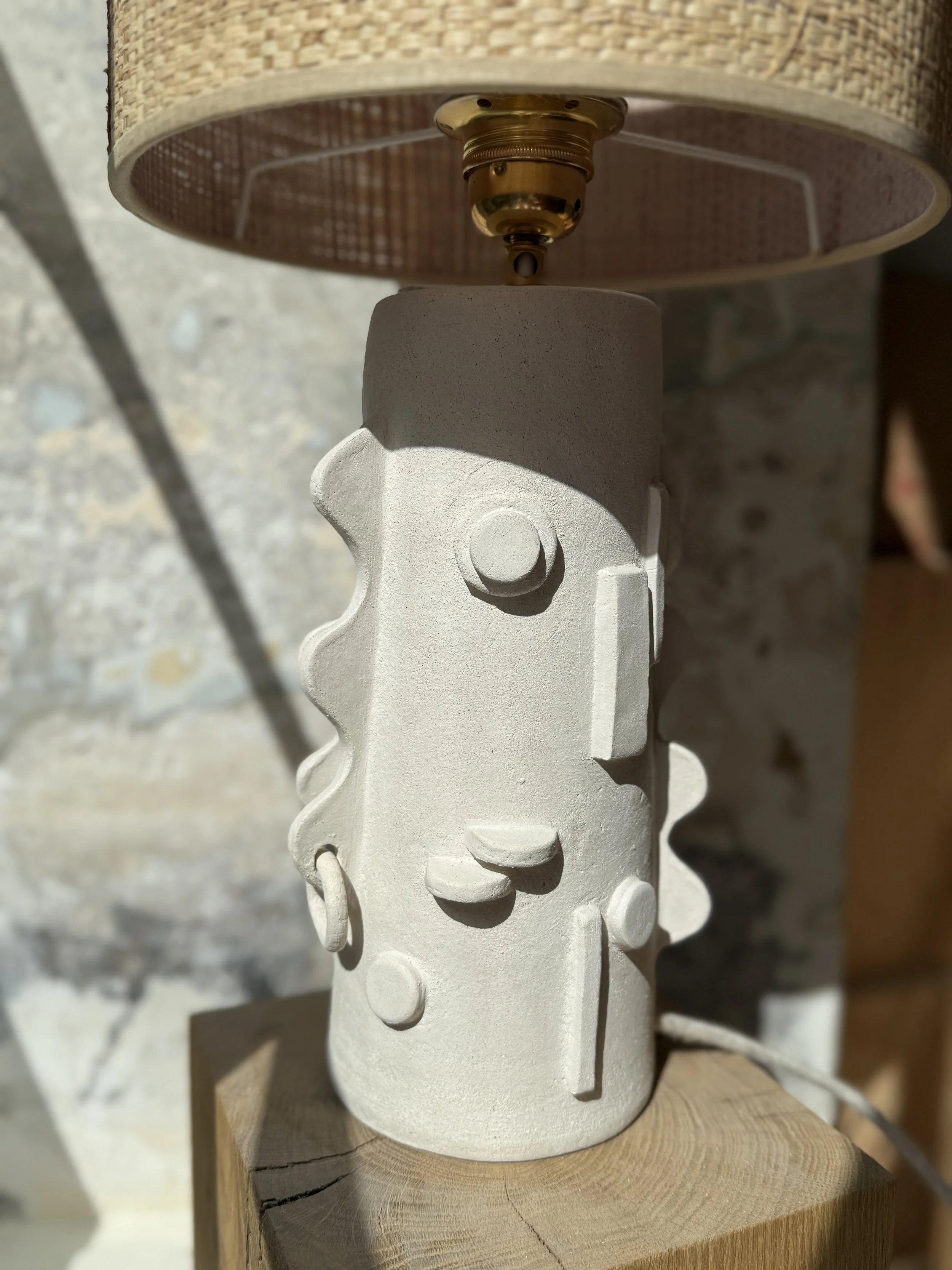 Tournée en grès légèrement chamotté. Abat-jour en matière naturelle.